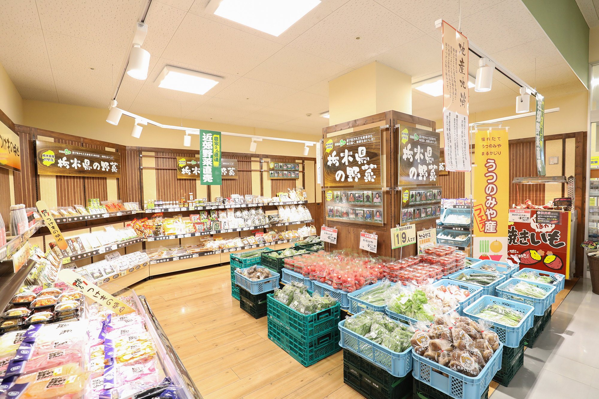 当店、青果コーナー脇には地場野菜コーナーがございます。地元宇都宮産の新鮮な野菜も数多く品揃えしております。産地や生産者の情報などを提供しながら、地産地消に取り組んでおります。