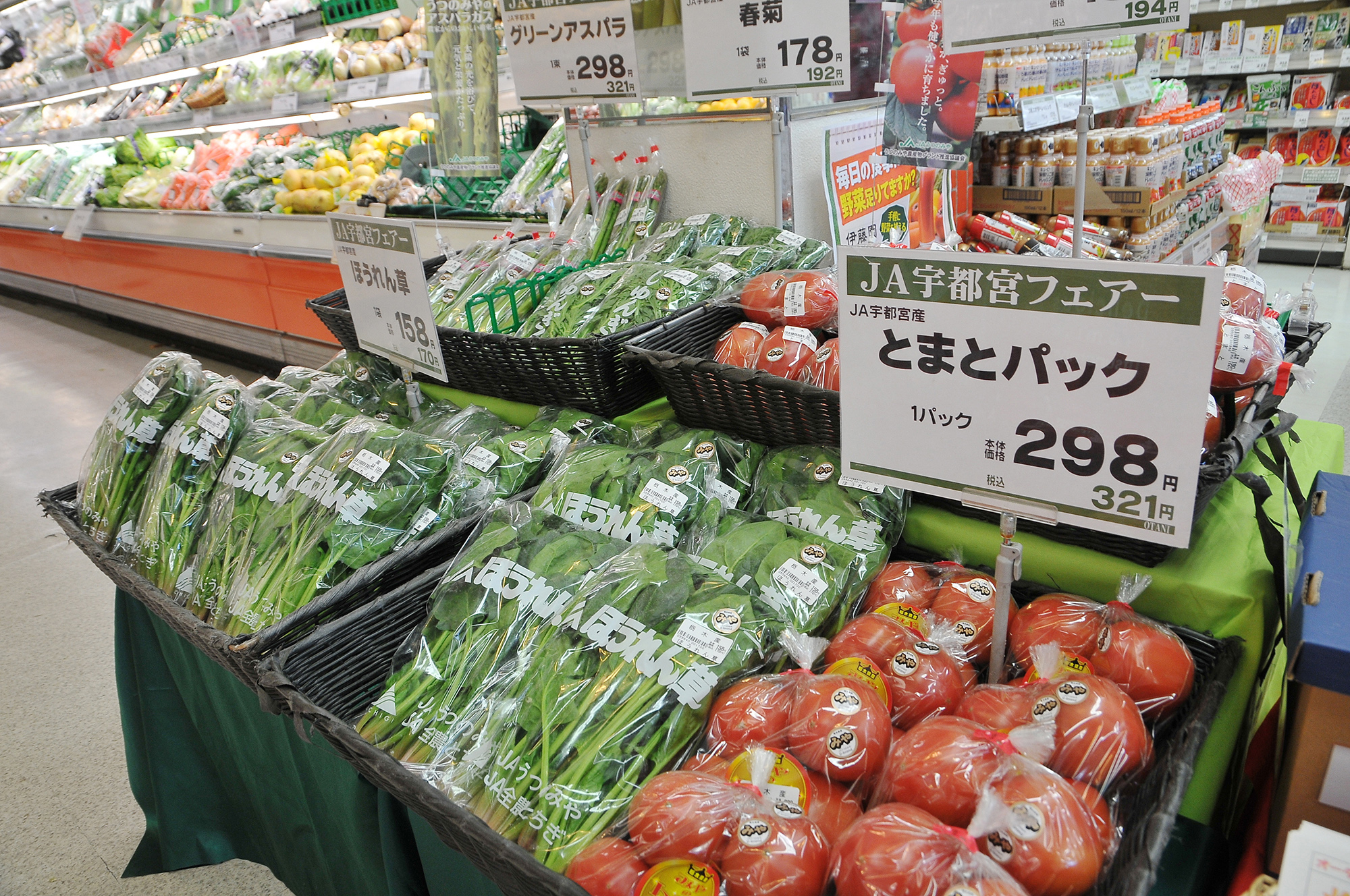 - 野菜(にら)、野菜(たまねぎ)、野菜(ほうれん草)、野菜(春菊)、野菜(ブロッコリー)、野菜(レタス)、野菜(にんじん)、畜産物(豚肉)、米(コシヒカリ)、米(ゆうだい21)、米(とちぎの星)、米(その他)、いちご(とちおとめ)、トマト(その他)、アスパラガス(その他)