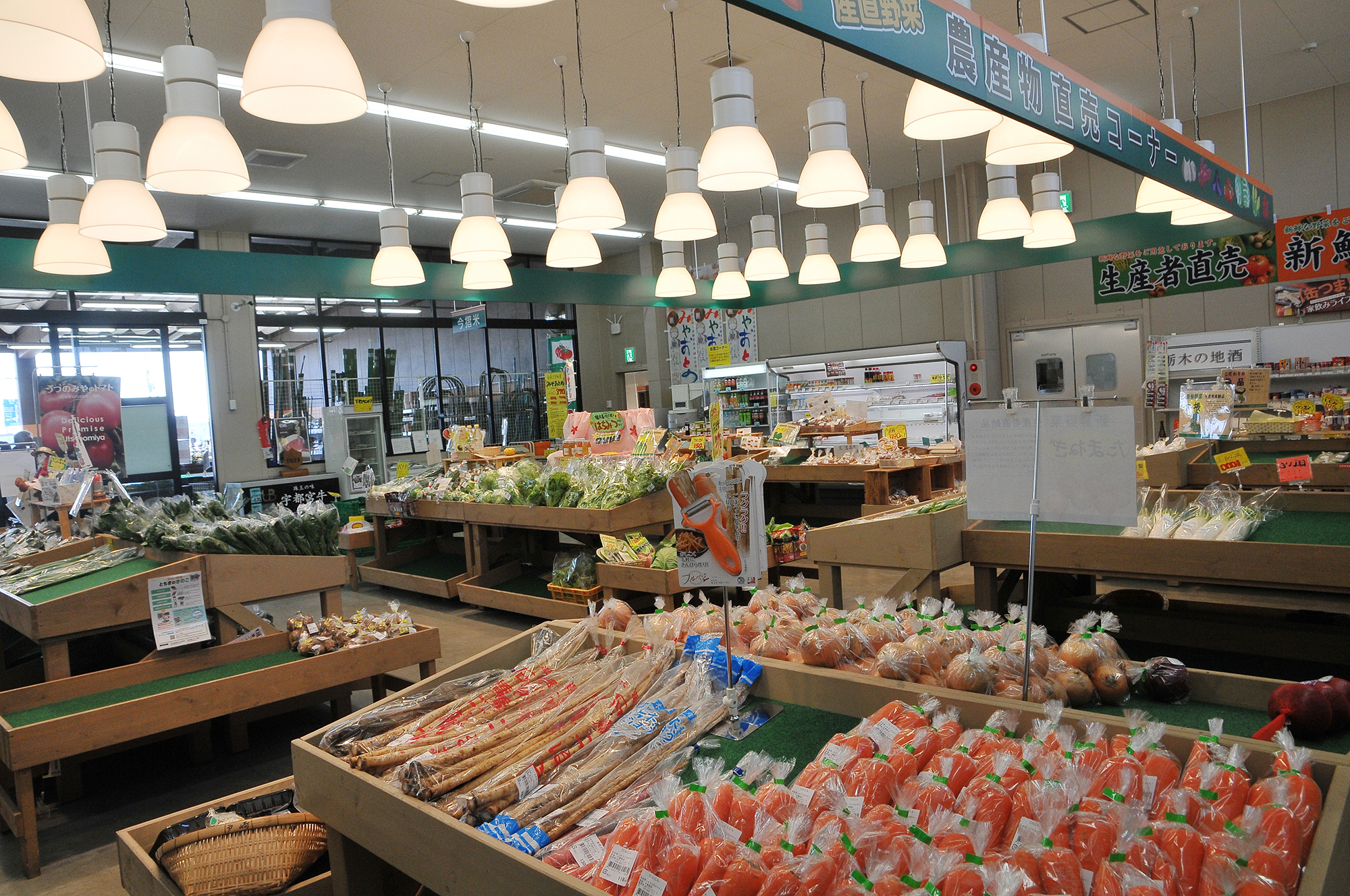 地元生産者が毎日納品する新鮮な青果物が並びます。春にはいちごやトマトがあり、とても人気です。毎月5日、第3日曜日は、宇都宮のブランド米「みやおとめ」を特価販売しております。