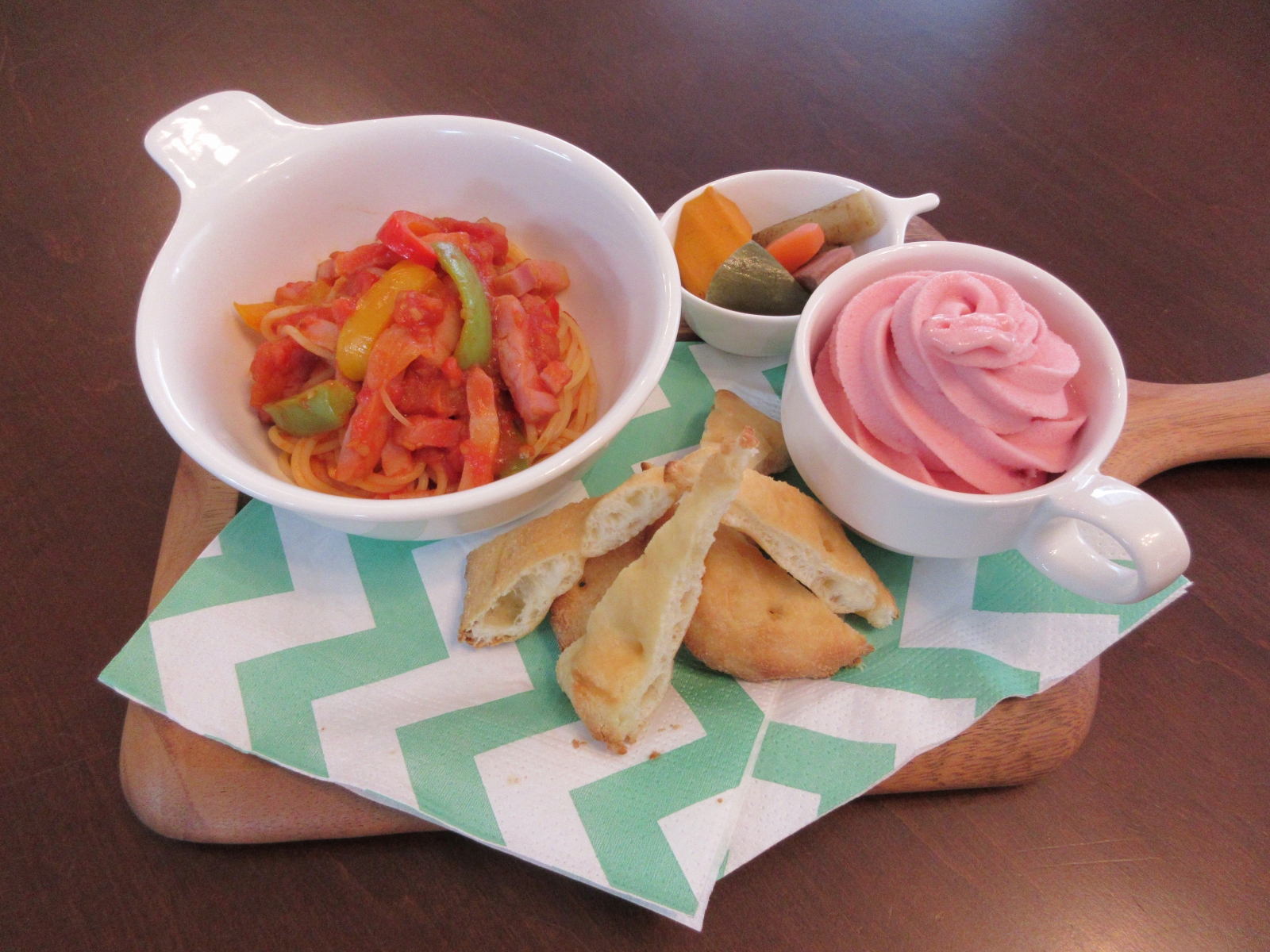 自家栽培の野菜を使ったぷっちぃーワンボードをおすすめしています。毎年トマトとタマネギには力を入れて栽培し,赤と黄のトマトソースを作っています。ベーコンと野菜のトマトソースパスタをご賞味あれ!